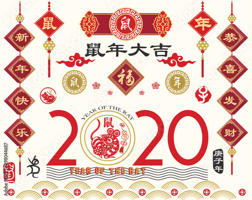 Year Of The Rat 2020 Chinese New Year Chinese Calligraphy Translation Rat Year Happy New Year And Gong Xi Fa Cai Prosperity Red Stamp With Vintage Rat Calligraphy Buy This Stock